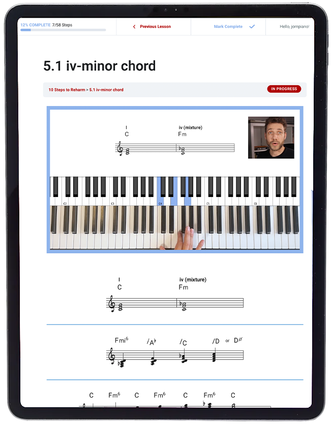 Imagine taking a familiar tune and transforming it into something uniquely yours - that's the power of reharmonization! With the "10 Steps to Reharm Course," you'll unlock the secrets to adding those captivating, hip chord changes that can completely turn a song upside down. This comprehensive video course is your gateway to creating exciting and unique versions of your favorite melodies, whether they're jazz standards, pop hits, or classic movie themes. Dive into a world where your piano playing is not just an act of reproduction, but a creative, transformative experience.